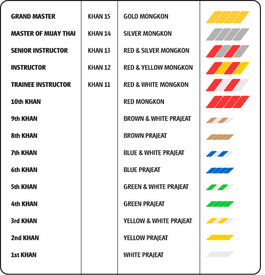 Im Muay Thai wird heutzutage auf Showtechniken verzichtet, viel mehr wird der sportliche Gedanke in den Vordergrund gestellt. Um auch die Sportart international weiter bekannt zu machen wurde ein Graduierungssystem eingeführt, dass durch die Farben des Mongkon und des Prajeat bestimmt wird. Im Muay Thai können Prüfungen zum jeweils höheren Khan abgelegt werden.