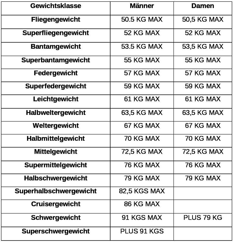 Gewichtsklassentabelle VK, KB, K-1, MT